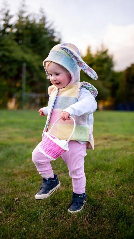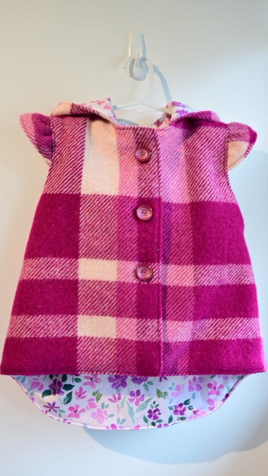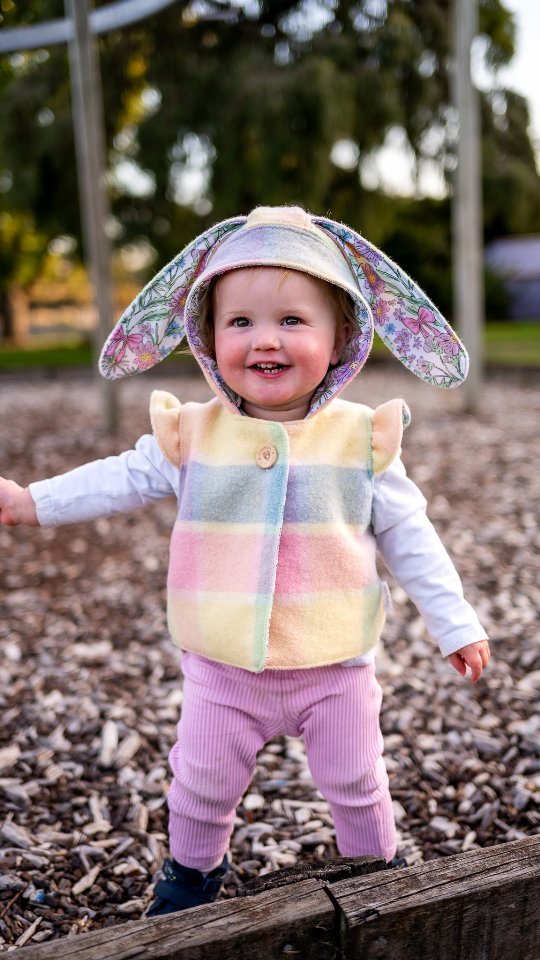 This adorable size 1 woollen vest has been handcrafted from an upcycled vintage wool blanket and lined with cute farmyard cotton. It features a round hood and button closure. Soft, breathable, and designed for comfort without the bulk, this vest keeps little explorers warm through every season — a timeless piece for all their big little adventures.